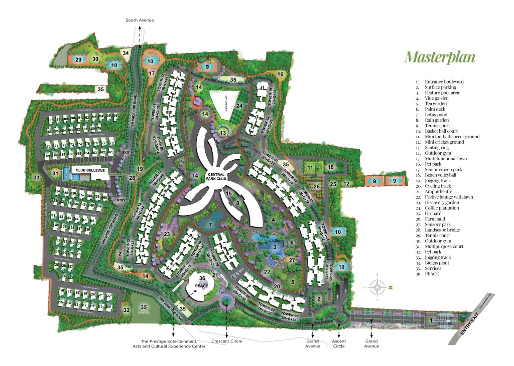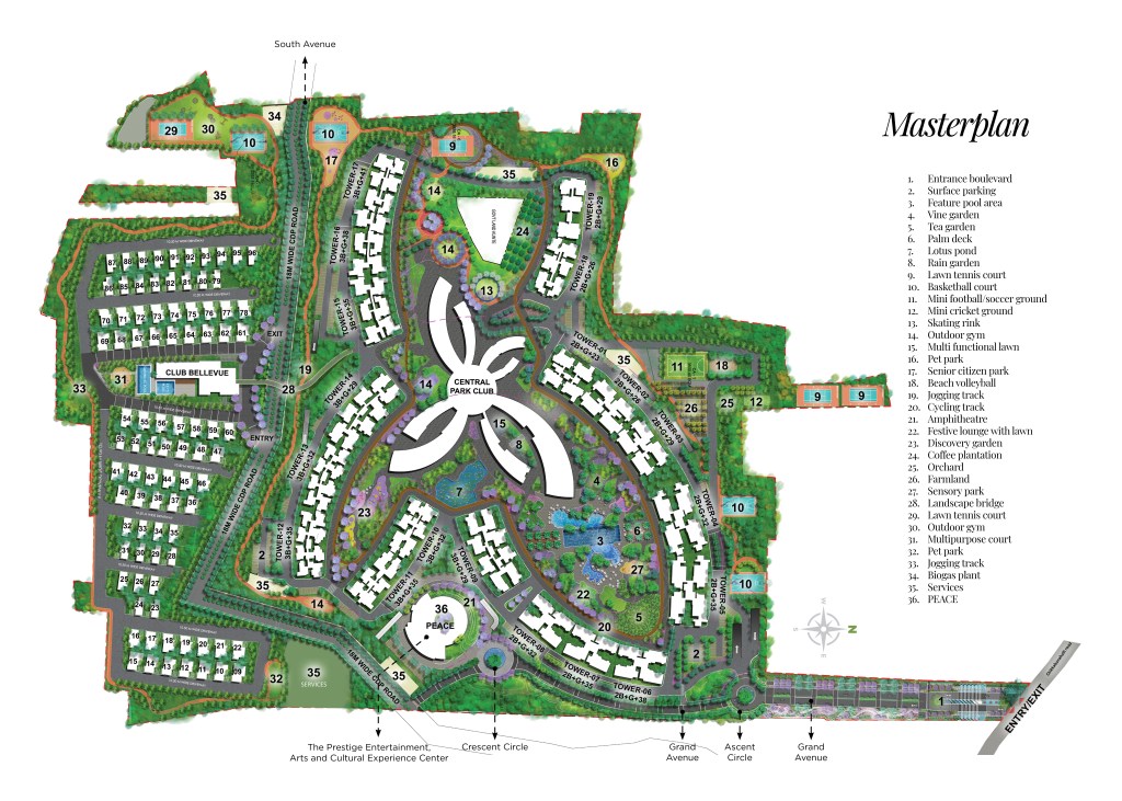 Prestige Park Grove is a luxurious township project by Prestige Group, located in Whitefield, Bangalore. The project is spread across 72 acres and offers a variety of housing options, including apartments and villas. The masterplan of Prestige Park Grove is designed to create a seamless blend of modern architecture, lush greenery, and world-class amenities.